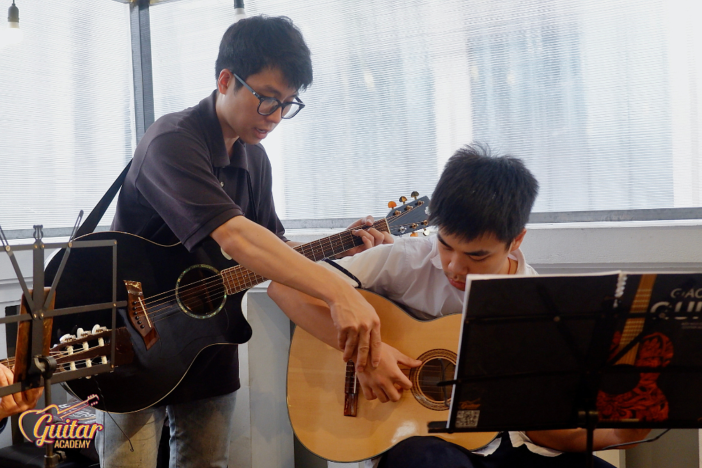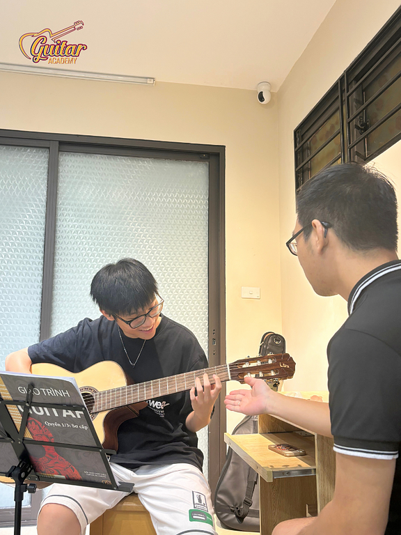 Ghé thăm lớp học guitar 1 thầy 2 trò tại cơ sở Láng Hạ, Guitar Academy không khỏi trầm trồ trước không khí vừa chuyên nghiệp vừa thoải mái. Với một thầy giáo trẻ cùng thế hệ Gen Z với học viên, thầy giáo Nhật Quang, dường như đã xóa nhòa khoảng cách tuổi tác với học viên, khiến buổi học trở nên siêu thú vị và đầy cảm hứng! Các bạn học viên không còn e ngại khi đặt câu hỏi hay chia sẻ những khó khăn trong quá trình học đàn.
