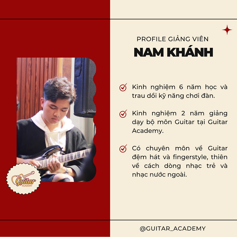 "Anh giáo" Nam Khánh là một người thầy giáo vô cùng thân thiện. Với kinh nghiệm giảng dạy và biểu diễn hơn 2 năm cùng phong cách truyền đạt đơn giản, anh Nam Khánh trở thành một trong những giảng viên được đông đảo học viên của Guitar Academy yêu mến và tin cậy.