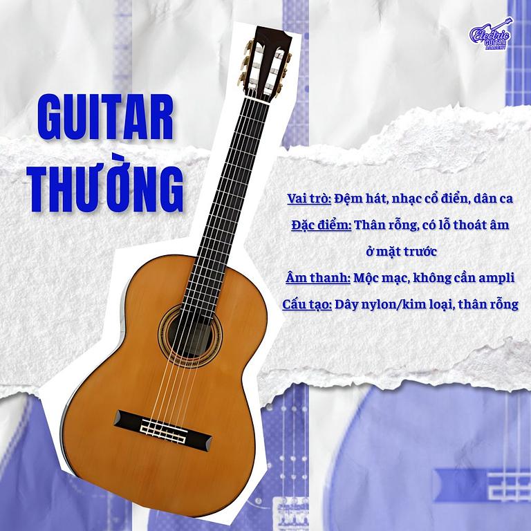 Guitar thường, hay còn gọi là Guitar acoustic (hoặc guitar classic), là loại đàn truyền thống nhất và thường là lựa chọn đầu tiên của những người mới học. Đặc điểm nổi bật của guitar thường là thân đàn rỗng, tạo ra âm thanh tự nhiên mà không cần thiết bị khuếch đại.