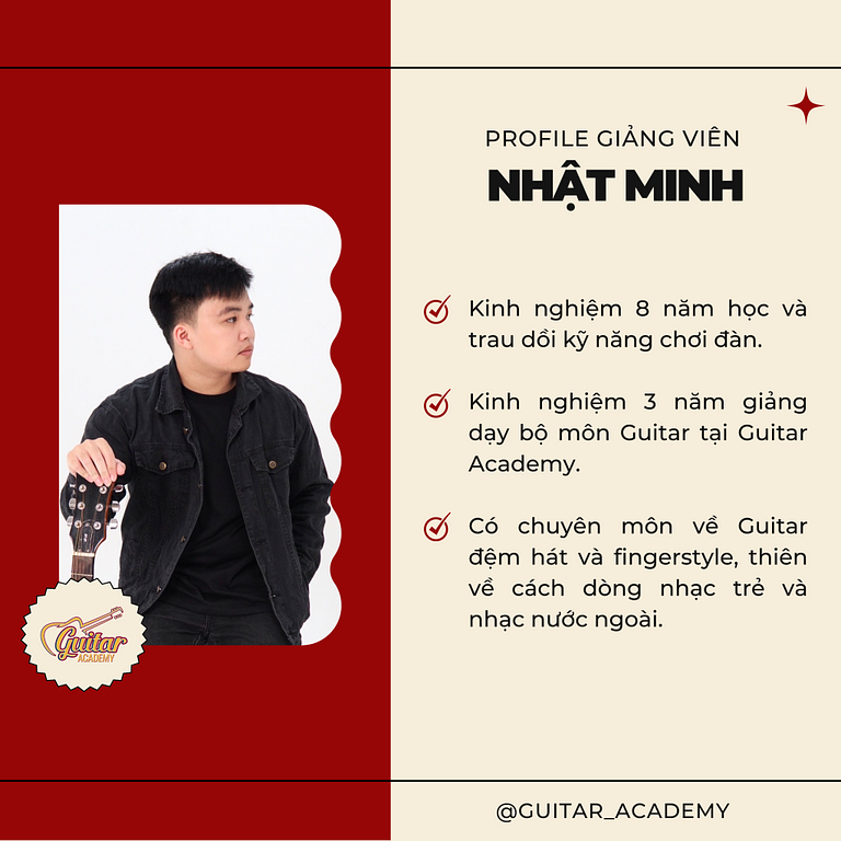 Nhắc đến giáo viên dạy guitar tại Guitar Academy Trần Quốc Vượng, không thể không kể đến thầy giáo tận tâm và nhiệt huyết tên Nguyễn Bùi Nhật Minh.